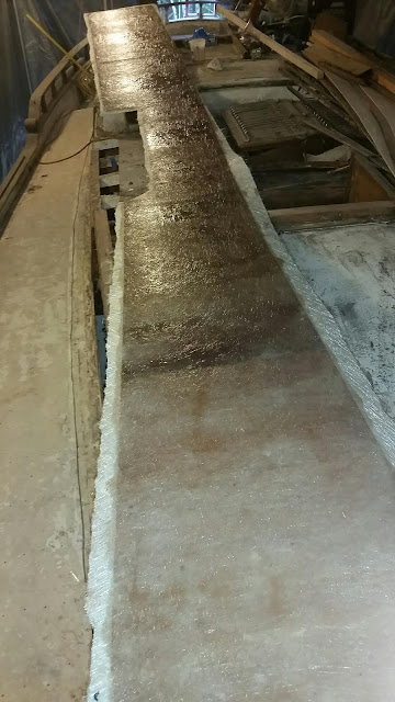 I put the second layer of fiberglass down on the wall on Friday. I struggled with time and temperature, and was at the boat until midnight with the diesel heater going and standing over it with a heat gun so the epoxy would cure. Next I'll sand, fill and paint before putting the wall back in place. That should happen tomorrow!